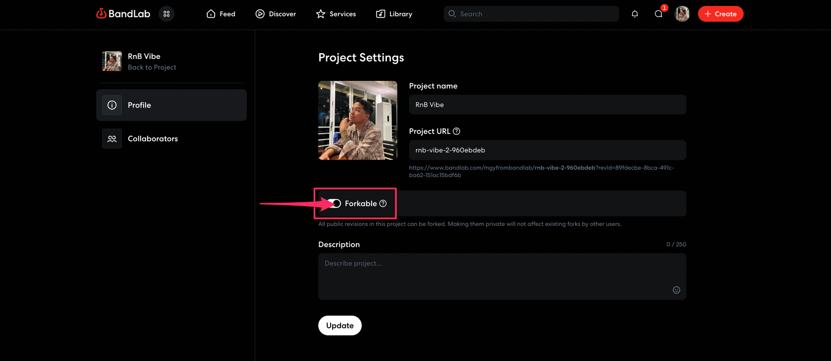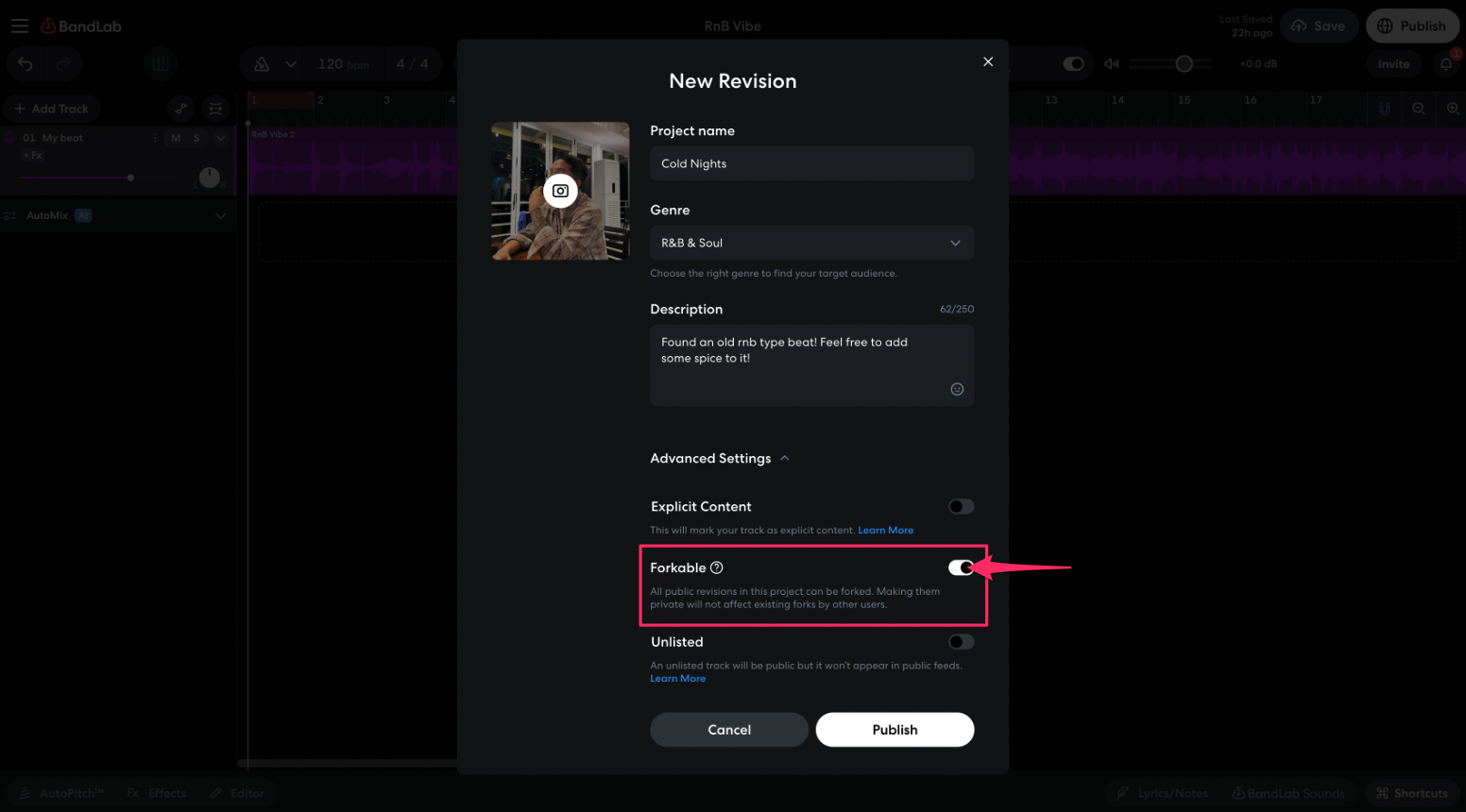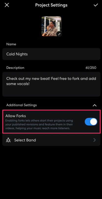 When you set a project to Forkable, you grant other users a private copy of your project to use however they wish. This allows users to build on the song, add to it, change it, and ultimately republish their own version. Enabling forks lets others feature your music in their music and videos, helping it reach more listeners.