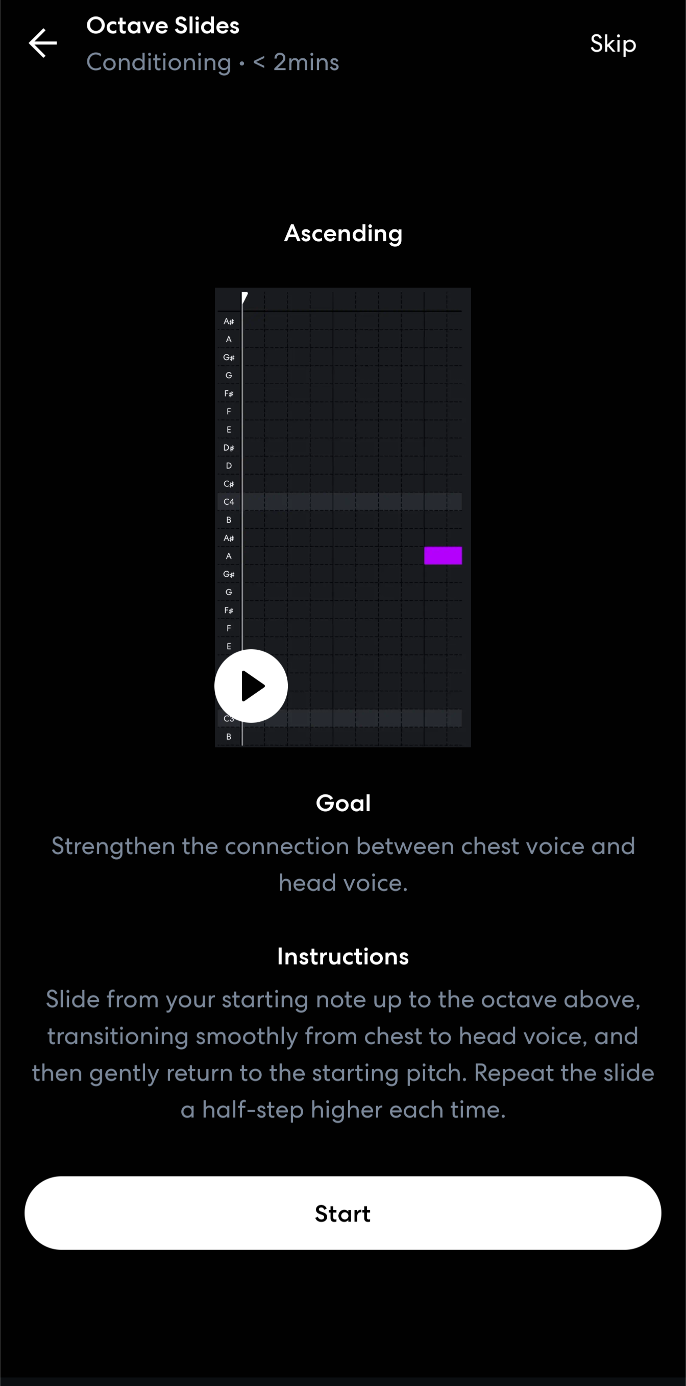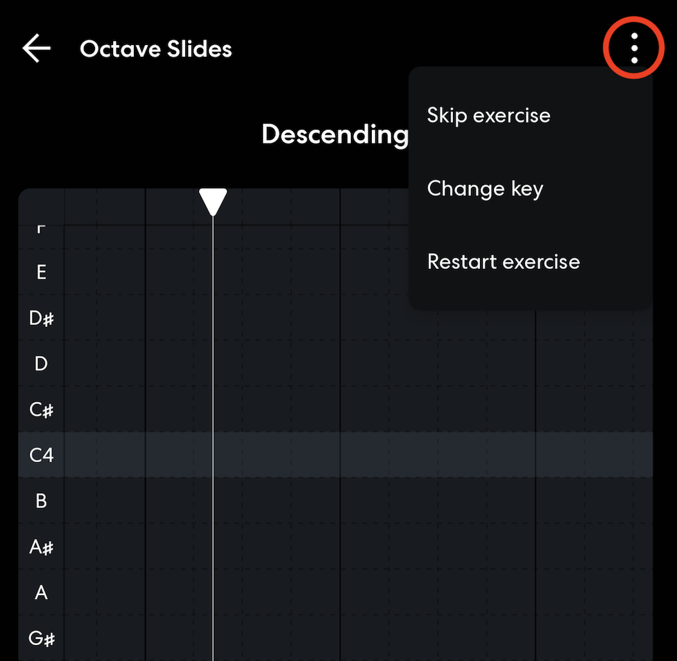 Tapping on the exercise will start it. Tapping on your current vocal range will allow you to retake the vocal detection test.