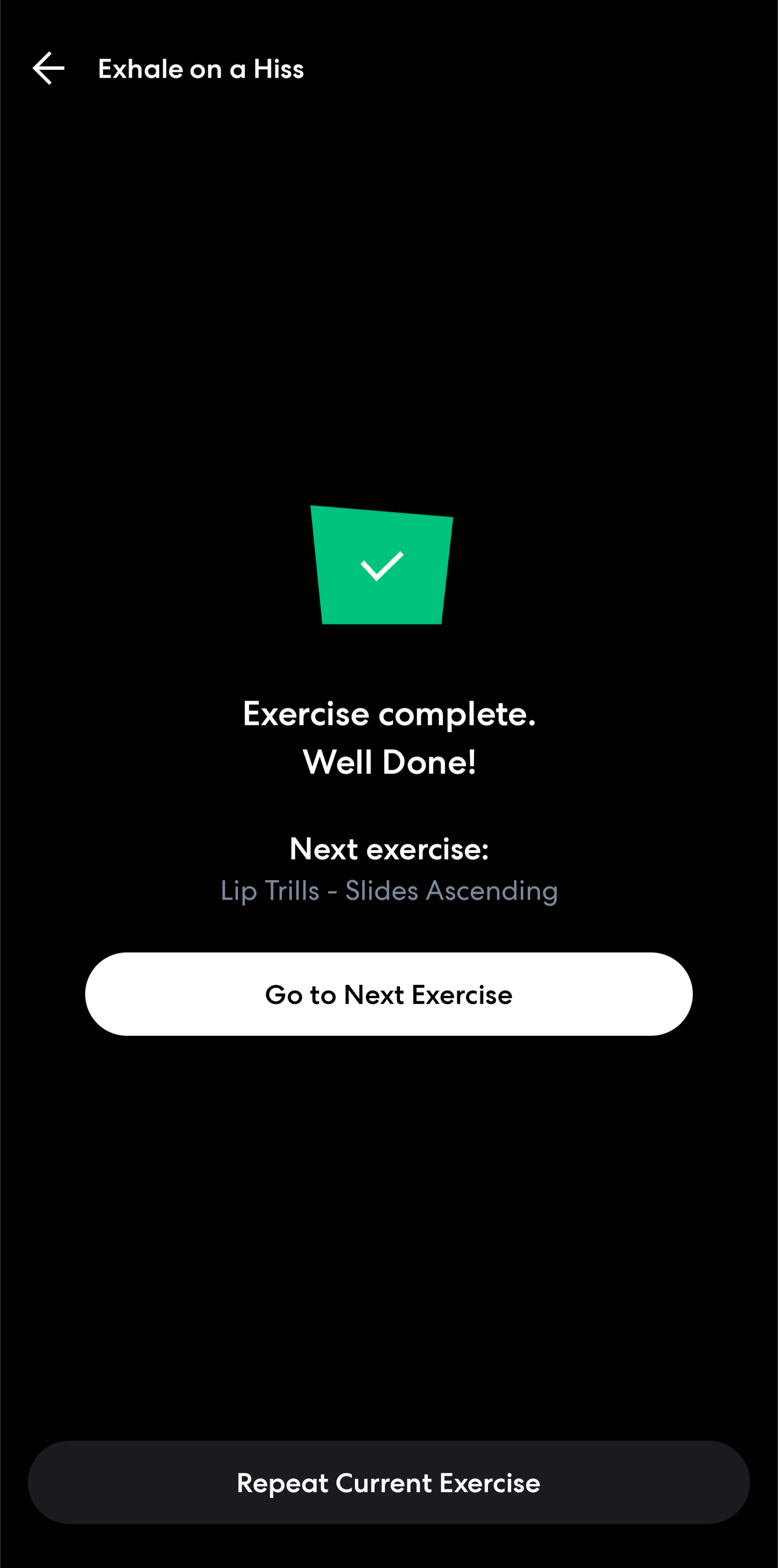 Once you completed the exercise, you will be able to repeat the exercise or go to the next one. Tapping on the Back arrow leads you back to the home page.