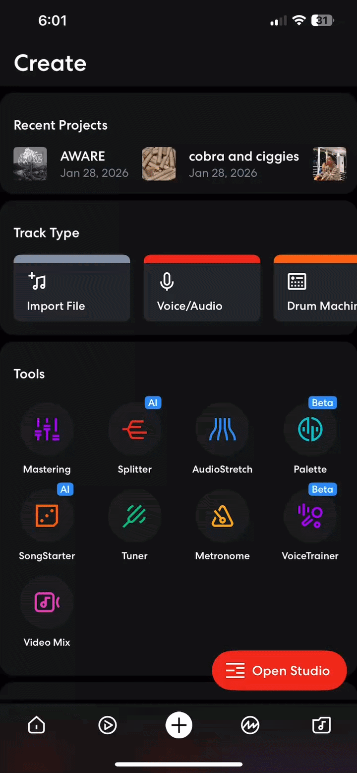 You can also import files from the Create tab by tapping the Import File button under the Track Type section